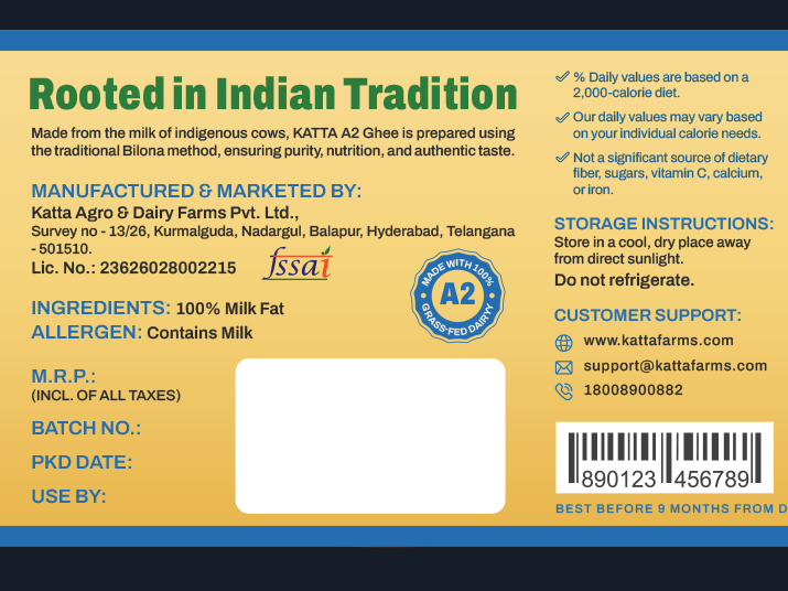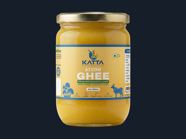 Katta Farms A2 Desi Cow Cultured Ghee is pure and radiant like gold, crafted exclusively from the milk of indigenous Gir A2 cows. Rooted in tradition, it carries a rich aroma, authentic flavor, and wholesome nourishment.