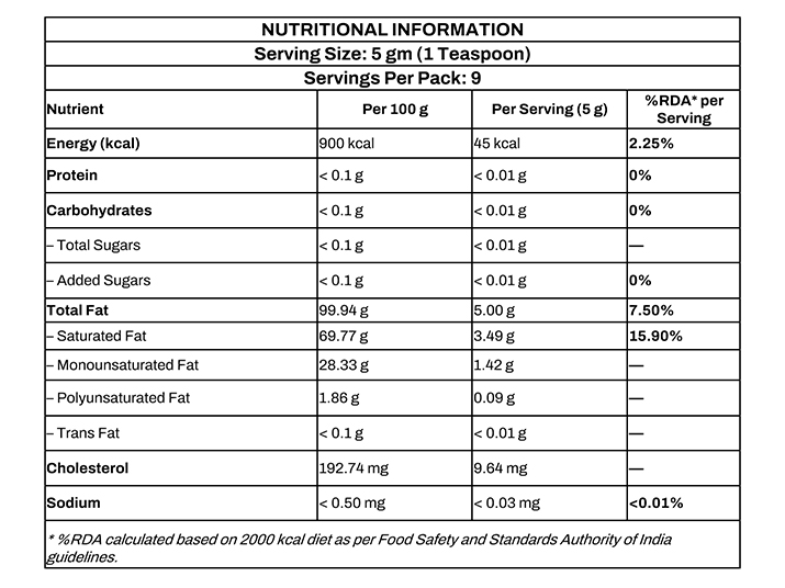 | Aroma | Characteristic rich aroma of cow ghee |